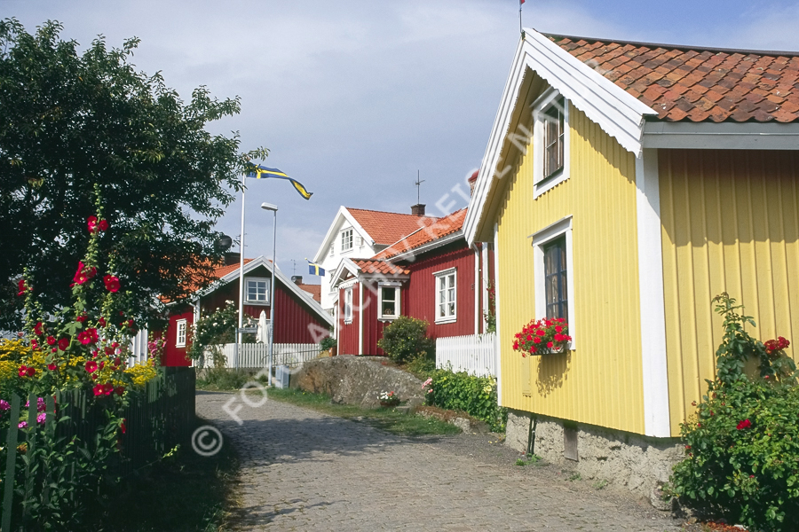 Bauwerk, Blume, Blumenschmuck, Bohuslän, Einfriedung, Fahne, Fahnenstange, Farbe, Flagge, Flora, Gasse, Gebäude, Gegenstand, Haus, Holzhaus, Holzzaun, Lattenzaun, Malvengewächs, Möllesund, Orust, Schweden, Stockmalve, Alcea rosea, Straße, Verkehrsweg, Västra Götlands län, Zaun, gelb, rot,