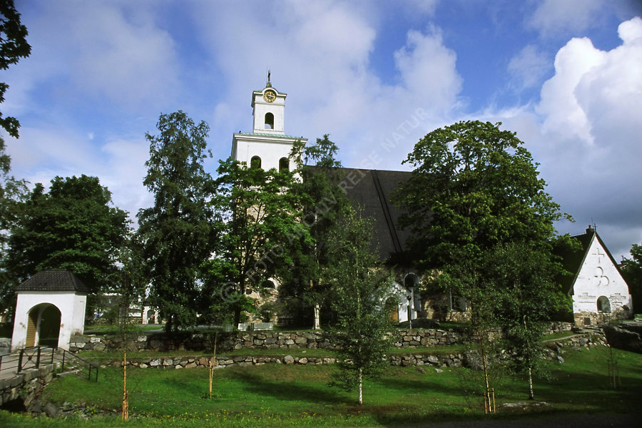 Baum, Bauwerk, Dach, Finnland, Flora, Gebäude, Gebäudeteil, Kirche, Kirchhof, Kirchturm, Kulturlandschaft, Mauer, Natursteinmauer, Rasen, Rauma, Sakralbau, Schindeldach, Steinkirche, Tor, Torhaus, Turm, Westfinnland, Wiese,