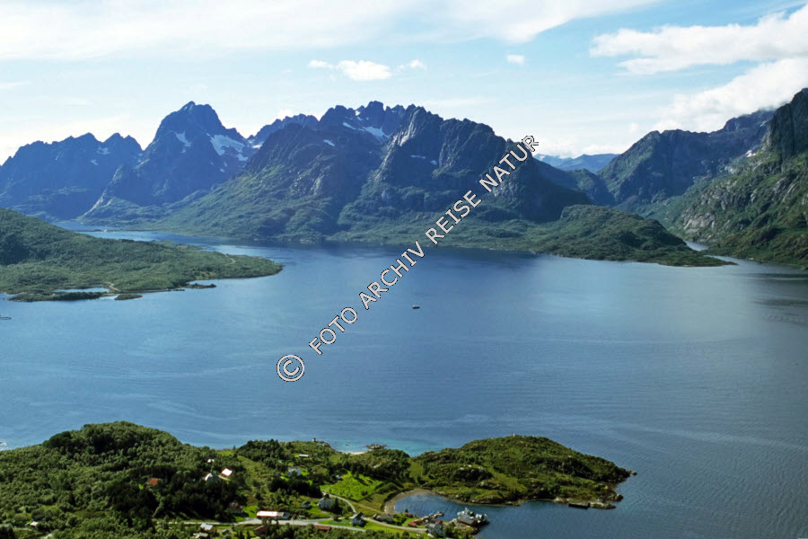 Berg, Digermulen, Dorf, Gewässer, Hinnøya, Kulturlandschaft, Landschaft, Lofoten, Nordland, Norwegen, Raftsundet, Sund, Süd-Hinnøy, Ulvågsund, Øyhellsund,