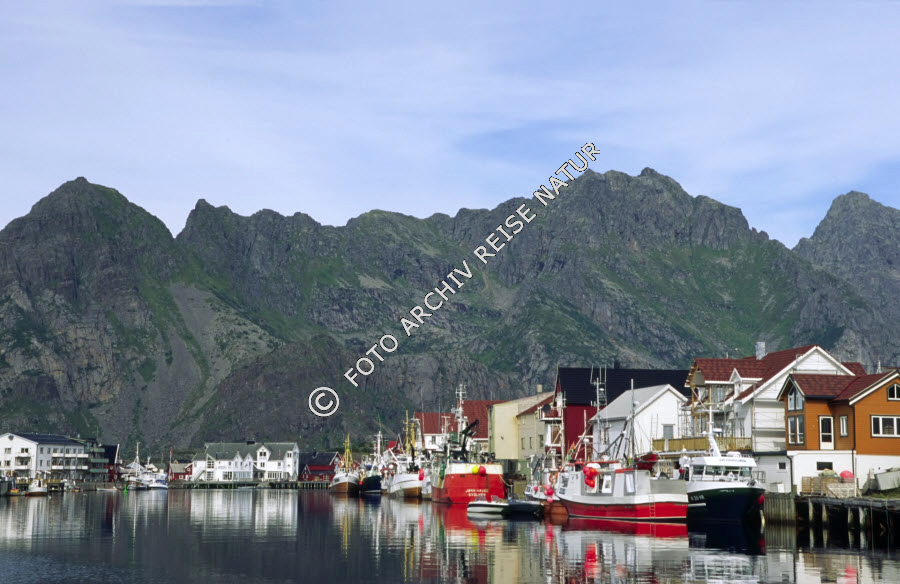 Austvågøya, Bauwerk, Berg, Bergkette, Fischereihafen, Fjord, Gebirge, Gewässer, Hafen, Henningsvær, Landschaft, Lofoten, Nordland, Norwegen, Vestfjorden,