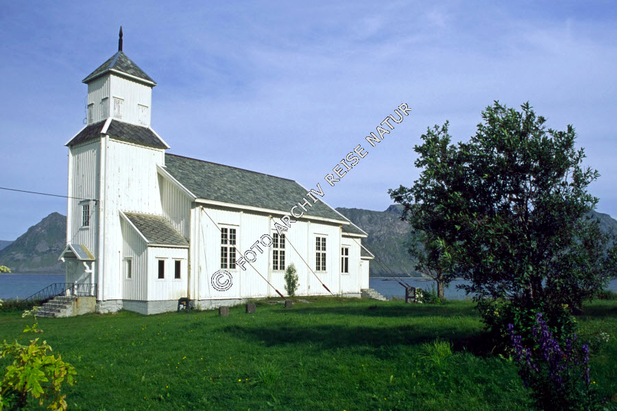 Bauwerk, Gebäude, Gewässer, Gezeitenstrom, Gimsøy, Gimsøysand, Gymsøystraumen, Holzkirche, Kirche, Landschaft, Lofoten, Meeresströmung, Nordland, Norwegen, Sakralbau,
