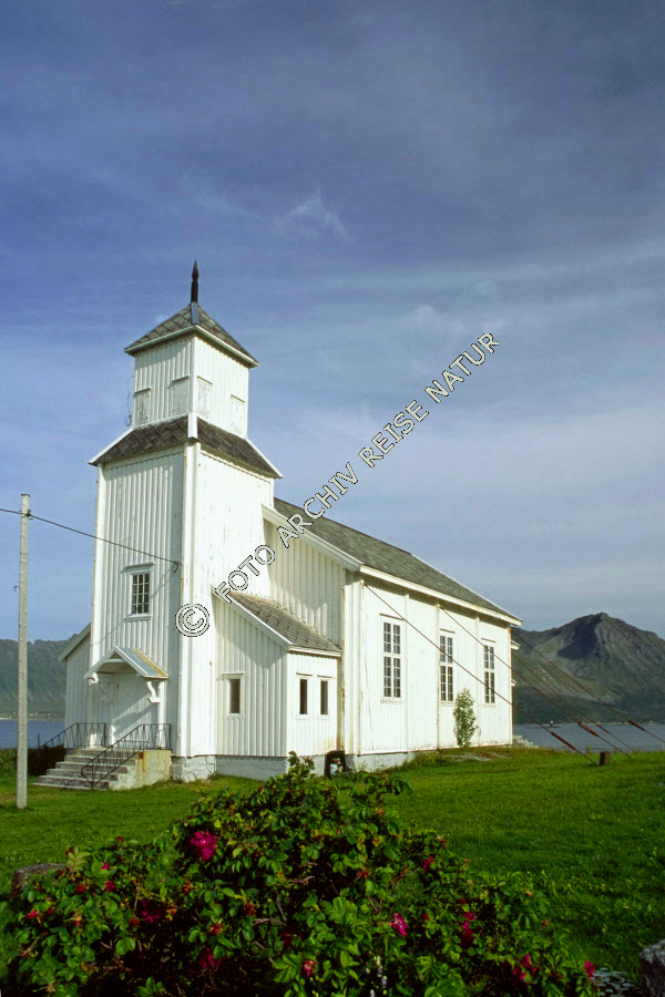 Keywords: Bauwerk, Gebäude, Gewässer, Gezeitenstrom, Gimsøy, Gimsøysand, Gymsøystraumen, Holzkirche, Kirche, Landschaft, Lofoten, Meeresströmung, Nordland, Norwegen, Sakralbau, Sturm, Sturmsicherung, Wetter, Klima, Wind,