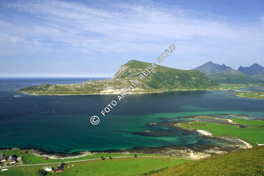 Keywords: Bauernhof, Bauwerk, Berg, Berghang, Gebäude, Gewässer, Hof, Hornsheia, Kulturlandschaft, Landschaft, Lofoten, Meer, Meeresströmung, Nordland, Nordmeer, Norwegen, Offersøystraumen, Vestvågøy, Wiese,