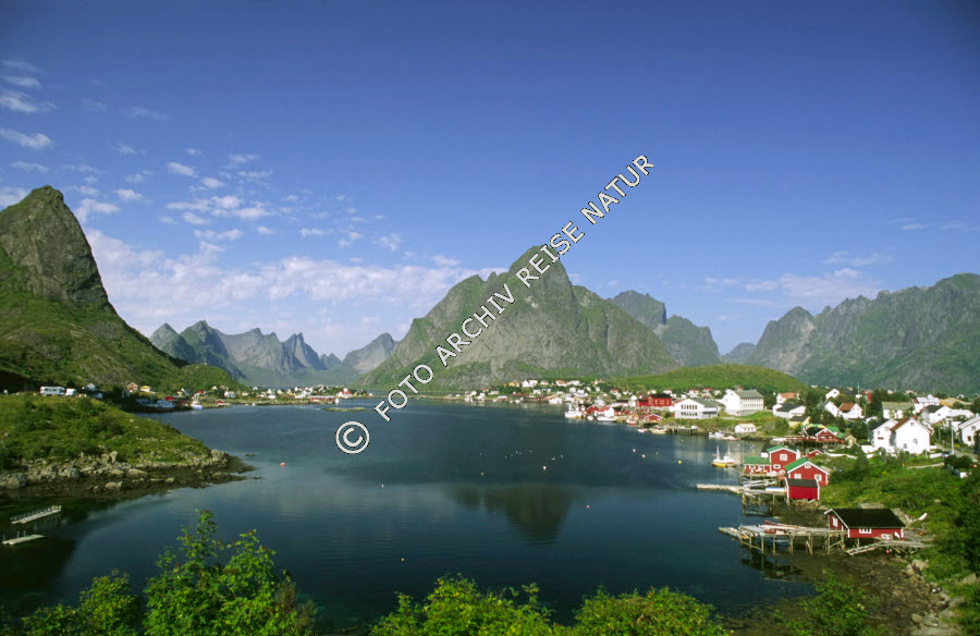 Berg, Berghang, Bergkette, Dorf, Fischerdorf, Fjord, Gebirge, Gewässer, Kulturlandschaft, Landschaft, Lofoten, Moskenesøy, Nordland, Norwegen, Reine, Reinefjorden,