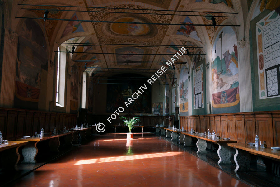 Keywords: Abtei, Kloster, Bauwerk, Crete, Fresko, Gebäude, Gegenstand, Gemälde, Italien, Kultur, Kunst, Monte Oliveto, Möbel, Refektorium, Sakralbau, Tisch, Toskana,