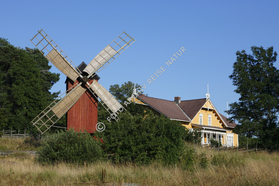 Baum, Bauwerk, Farbe, Finnland, Finström, Flora, Gebäude, Gutshaus, Herrenhaus, Mühle, Pålsböle, Windmühle, blau, rot, Åland,