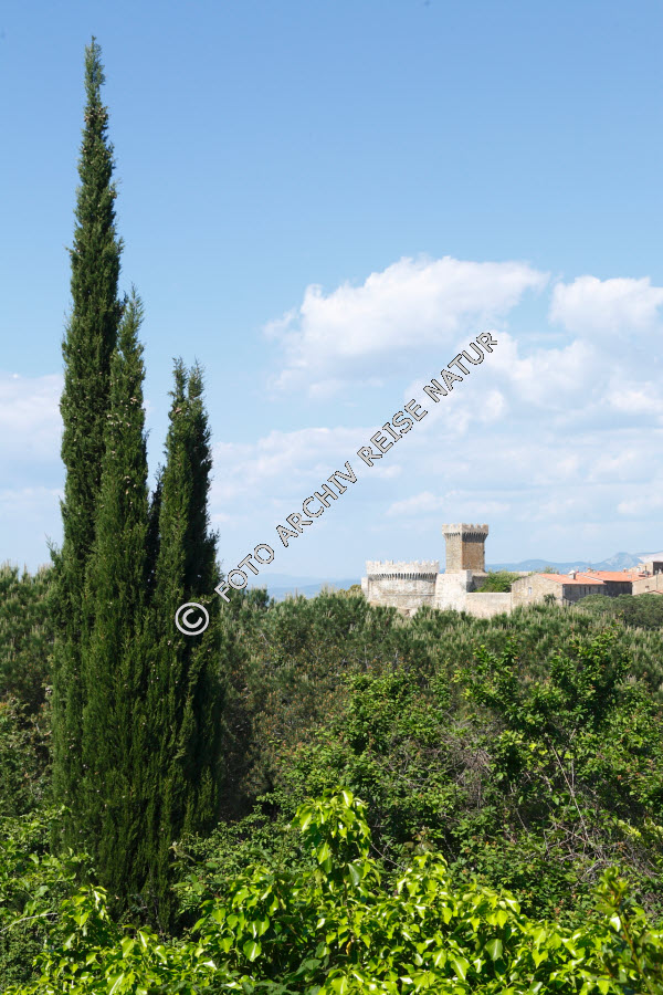 Baum, Bergdorf, Dorf, Flora, Italien, Kulturlandschaft, Landschaft, Populonia, Toskana, Wald, Wetter, Klima, Wolke, Zypresse, Cupressus, Zypressengewächs,