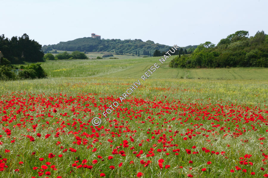 Blume, Flora, Gras, Hügel, Italien, Klatschmohn, Papaver rhoeas, Kulturlandschaft, Landschaft, Mohngewächs, Toskana, Val di Cornia, Wald, Wiese,