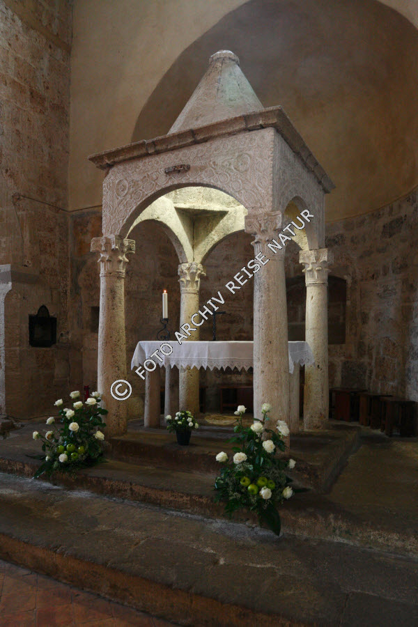 Altar, Baustil, Bauwerk, Blume, Blumenschmuck, Chor- Altarraum, Flora, Gebäudeteil, Italien, Marmor, Material, Naturstein, Sovana, Stein, Säule, Toskana, Tuff, Vorromanik, Ziborium,
