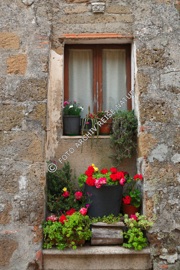 Blume, Blumenschmuck, Fenster, Flora, Gebäudeteil, Italien, Material, Naturstein, Sovana, Stein, Toskana, Tuff,