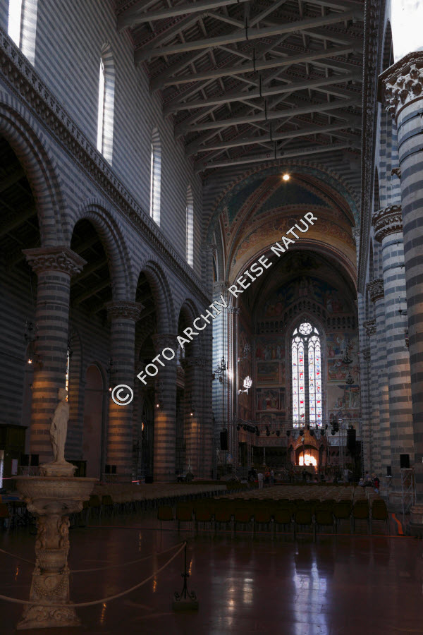 Baustil, Bauwerk, Becken, Bleiglasfenster, Dach, Dachstuhl, Fenster, Gebäude, Gebäudeteil, Gegenstand, Gotik, Italien, Kapitell, Kirche, Kirchenschiff, Mittelschiff, Orvieto, Romanik, Sakralbau, Säule, Taufbecken, Umbrien,