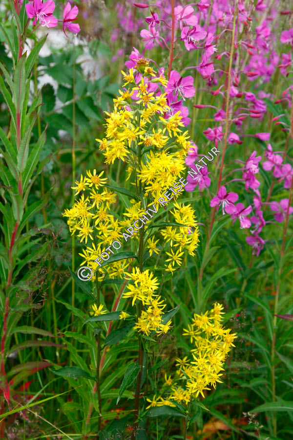 Austvågøya, Blume, Blüte, Flora, Goldrute, Solidago virgaurea, Korbblütler, Lofoten, Nachtkerzengewächs, Nordland, Norwegen, Pflanzenteil, Schmalblättriges Weidenröschen, Epilobium angustifolium, Svolvær,