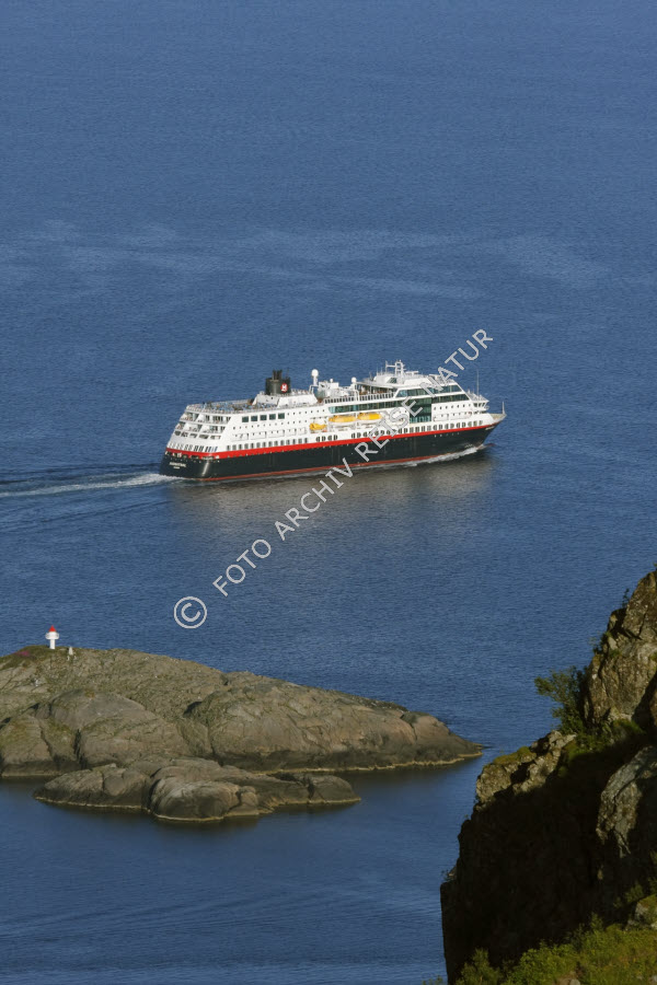 Hurtigrutenschiff bei der Ausfahrt aus dem Hafen von Svolvær