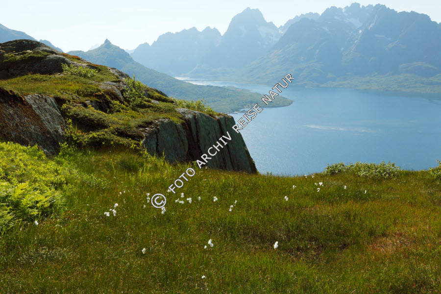 Bergkette, Bergmassiv, Digermulen, Felsen, Felsklippe, Felswand, Fjell, Flora, Gebirge, Gewässer, Gras, Hinnøya, Insel, Landschaft, Lofoten, Material, Nordland, Norwegen, Raftsundet, Sauergrasgewächs, Schmalblättriges Wollgras, Eriophorum angustifolium, Stein, Stormolla, Sund, Süd-Hinnøy, Øyhellsund,