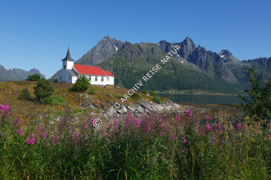 Austnesfjorden, Austvågøya, Bauwerk, Bergkette, Bergmassiv, Blume, Felsen, Felswand, Fjord, Flora, Gebirge, Gebäude, Gewässer, Kirche, Kirchturm, Landschaft, Lofoten, Material, Nachtkerzengewächs, Nordland, Norwegen, Sakralbau, Schmalblättriges Weidenröschen, Epilobium angustifolium, Sildpollneset, Stein, Turm,