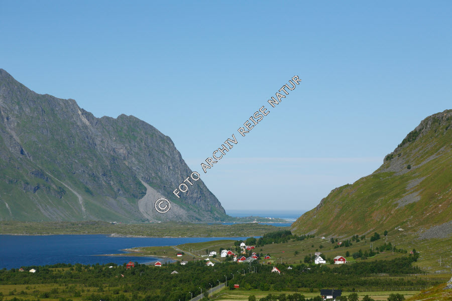 Baum, Bauwerk, Berg, Berghang, Bodden, Borge, Dorf, Flora, Gewässer, Gras, Kulturlandschaft, Landschaft, Lofoten, Meer, Nordland, Nordmeer, Norwegen, Strauch, Straße, Verkehrsweg, Vestvågøy, Weide, Weiler,
