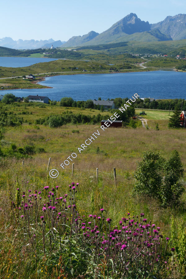 Baum, Bauwerk, Bodden, Borge, Dorf, Englische Kratzdistel, Cirsium dissectum, Flora, Gewässer, Gras, Korbblütler, Kulturlandschaft, Landschaft, Lofoten, Nordland, Norwegen, Strauch, Straße, Verkehrsweg, Vestvågøy, Weide, Weiler,