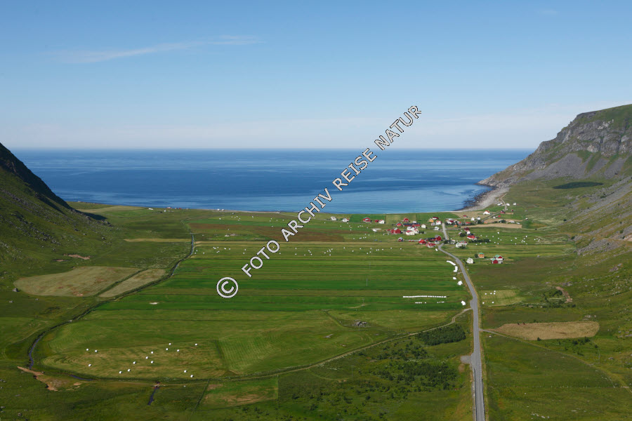 Keywords: Bach, Berg, Berghang, Bucht, Dorf, Gewässer, Kulturlandschaft, Landschaft, Lofoten, Meer, Nordland, Nordmeer, Norwegen, Unnstad, Vestvågøy, Weide, Weiler,