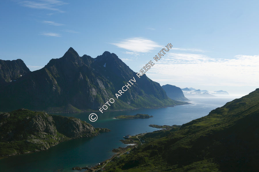 Sicht auf Himmeltindan, Steinsfjord, Bjørnarøya und Mærvoll