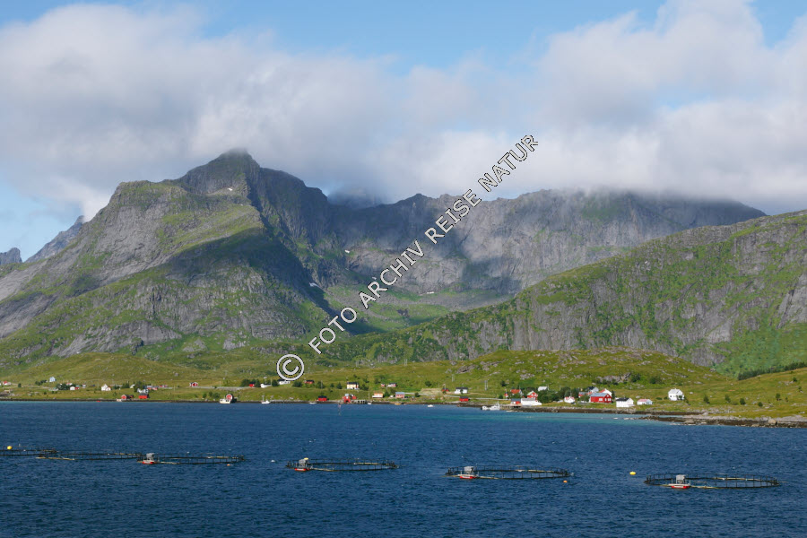 Keywords: Aquakultur, Dorf, Gewässer, Kulturlandschaft, Landschaft, Lofoten, Moskenesøy, Nordland, Norwegen, Sund, Sundstraumen, Weiler, Wetter, Klima, Wolke,