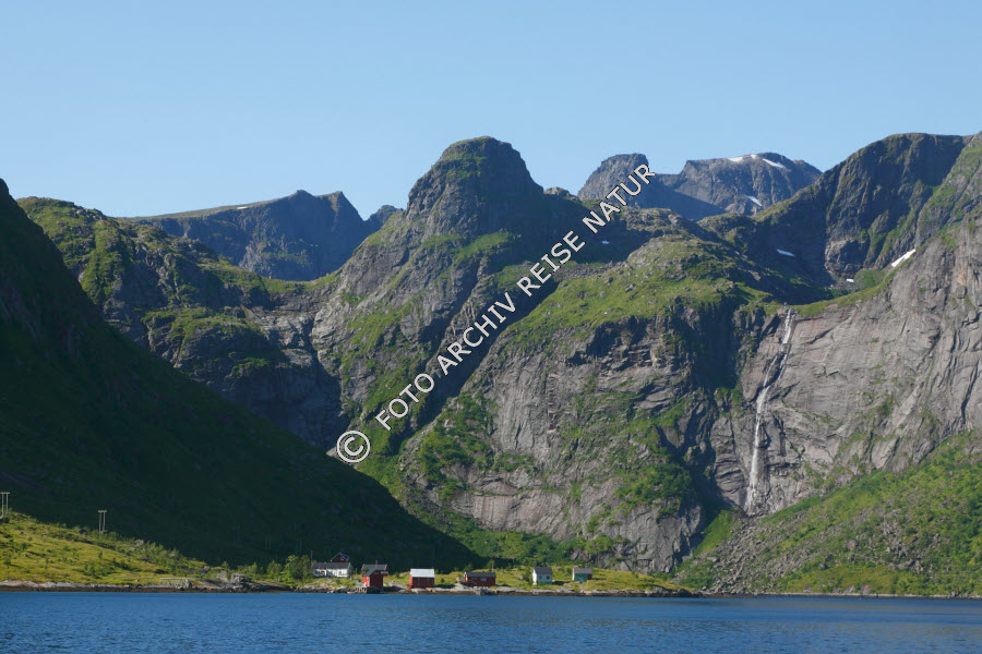Keywords: Berg, Berghang, Dorf, Felsen, Felswand, Fjord, Forsfjorden, Gewässer, Kulturlandschaft, Landschaft, Lofoten, Material, Moskenesøy, Nordland, Norwegen, Stein, Vindstad, Wasserfall, Weiler,