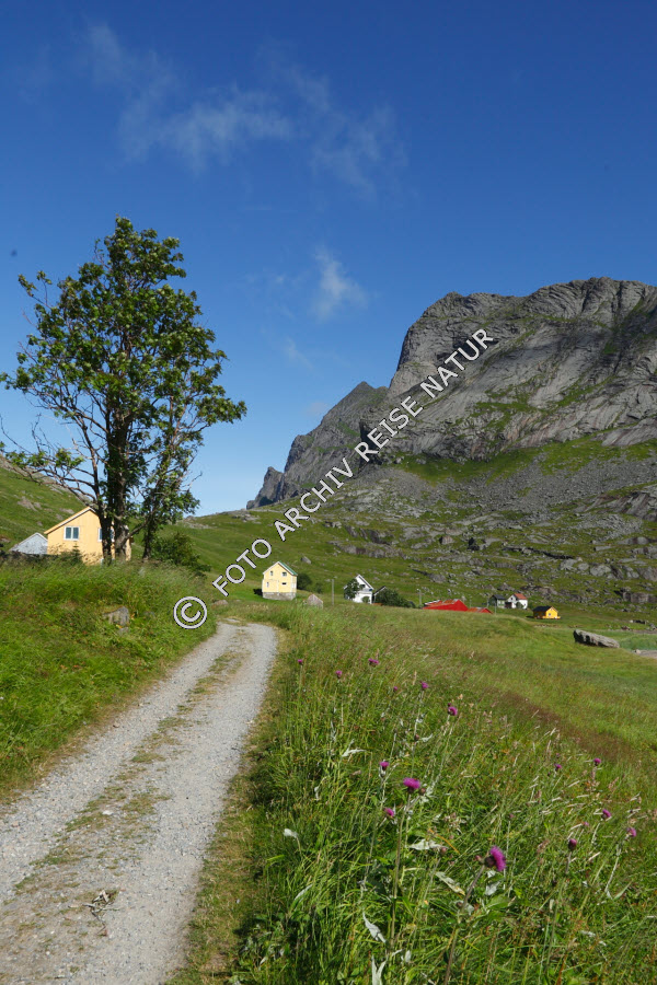 Bauwerk, Berg, Dorf, Feldweg, Flora, Gras, Knollige Kratzdistel, Cirsium tuberosum, Korbblütler, Kulturlandschaft, Landschaft, Lofoten, Moskenesøy, Nordland, Norwegen, Verkehrsweg, Vindstad, Wanderweg, Weg, Weide, Weiler,