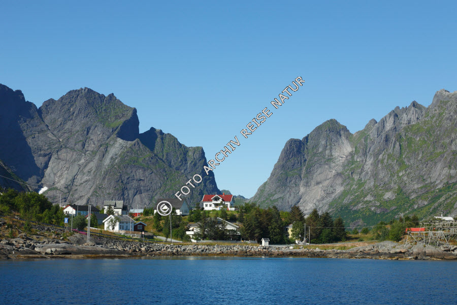 Keywords: Baum, Bauwerk, Berg, Felsen, Felswand, Fjord, Flora, Gebäude, Gegenstand, Gestell, Gewässer, Haus, Landschaft, Lofoten, Material, Moskenesøy, Nordland, Norwegen, Reine, Reinefjorden, Stein, Steinhaus, Stockfisch-Tr, Stockfisch-Trockengestell, Wetter, Klima, Wolke,