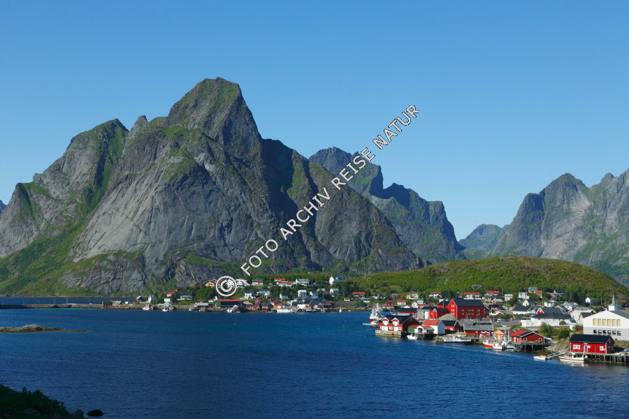 Bauwerk, Berg, Bootsanleger, Dorf, Felsen, Felswand, Fischerdorf, Fjord, Gewässer, Kulturlandschaft, Landschaft, Lofoten, Material, Moskenesøy, Nordland, Norwegen, Reine, Reinefjorden, Stein, Wald,