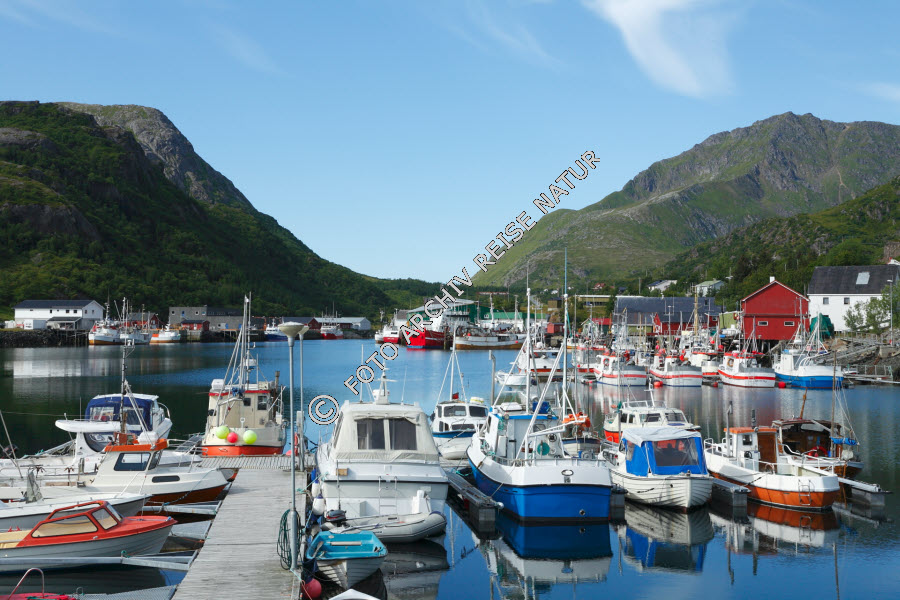 Bauwerk, Berg, Berghang, Dorf, Fischerdorf, Fischereihafen, Flakstadøy, Gewässer, Gezeitenstrom, Hafen, Kulturlandschaft, Landschaft, Lofoten, Meeresströmung, Napp, Nappstraumen, Nordland, Norwegen,