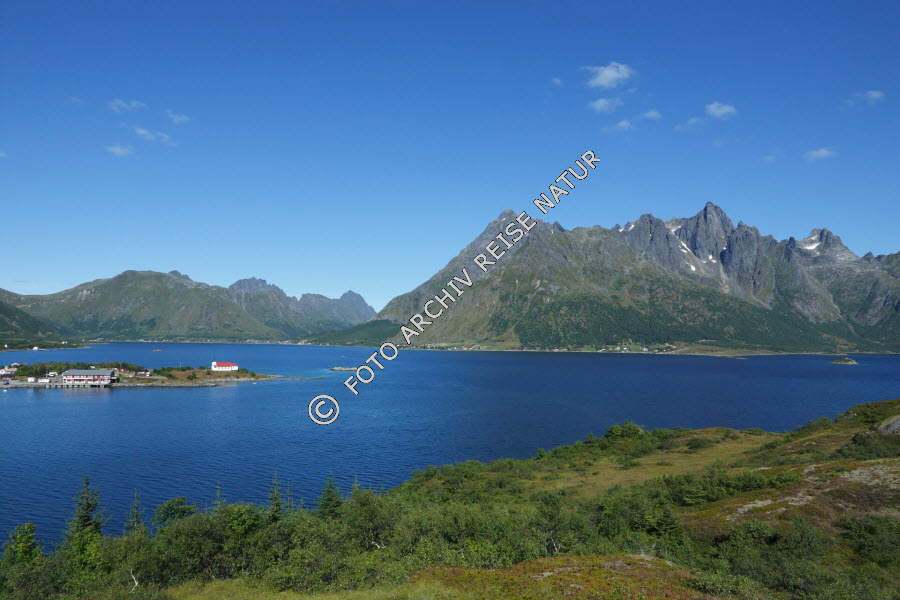 Keywords: Aussichtspunkt, Austnesfjorden, Austvågøya, Bauwerk, Bergkette, Bergmassiv, Fjell, Fjord, Gebirge, Gebäude, Gewässer, Kirche, Landschaft, Lofoten, Nordland, Norwegen, Ort, Sakralbau, Sildpollneset, Steinkirche,