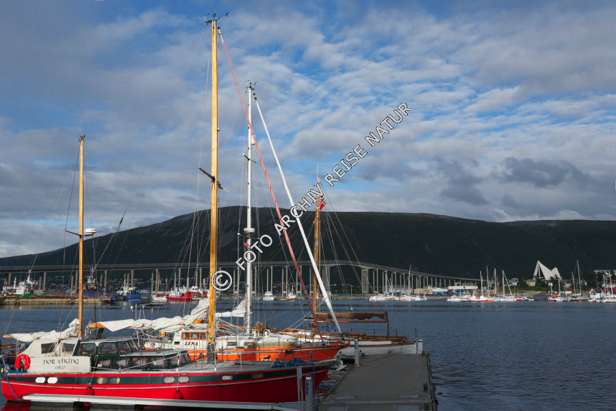 Bauwerk, Berg, Brücke, Eismeer-Kathedrale, Fahrzeuge, Gebäude, Gewässer, Kirche, Landschaft, Norwegen, Sakralbau, Sund, Troms, Tromsø, Tromsøsund, Verkehrsmittel, Verkehrsweg, Wasserf, Wetter, Klima, Wolke,