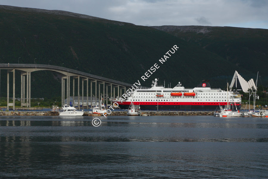 Bauwerk, Berg, Bergwald, Brücke, Eismeer-Kathedrale, Gebäude, Gewässer, Hafen, Kirche, Landschaft, Norwegen, Sakralbau, Sund, Troms, Tromsø, Tromsøsund, Verkehrsweg, Wald,
