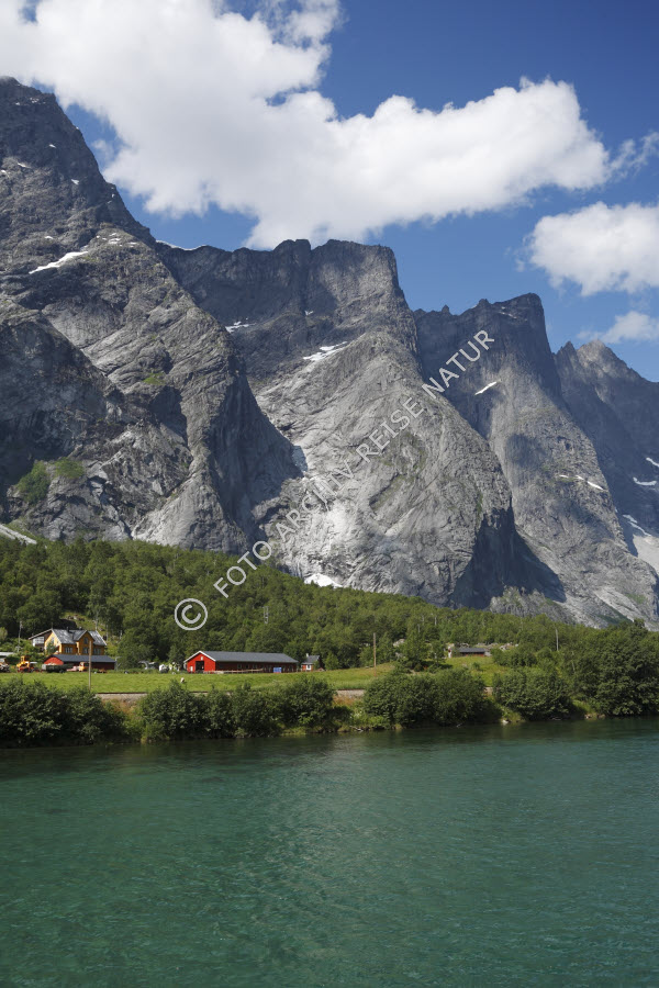 Bauernhof, Bauwerk, Berg, Bergkette, Bergmassiv, Flora, Fluss, Gebirge, Gebäude, Gewässer, Hof, Landschaft, Møre og Romsdal, Norwegen, Rauma, Romsdalen, Strauch, Wald,