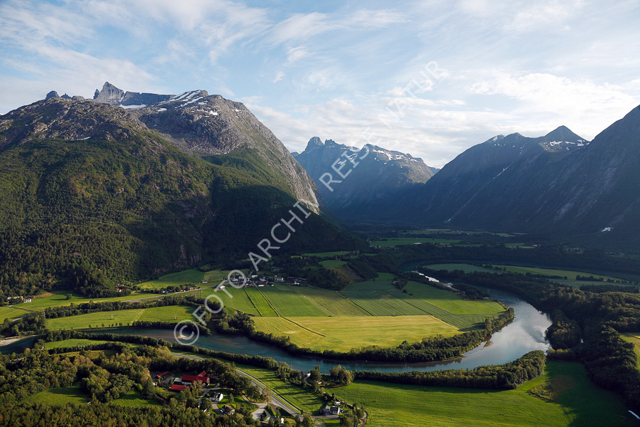 Berg, Bergkette, Bergmassiv, Fluss, Gebirge, Gewässer, Kulturlandschaft, Landschaft, Mjelva, Møre og Romsdal, Norwegen, Rauma, Tal, Wald, Wiese, Åndalsnes, Rauma,