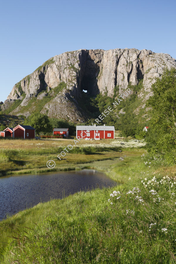 Keywords: Bach, Bauernhof, Baum, Bauwerk, Berg, Birke, Betula, Birkengewächs, Brønnøysund, Flora, Gebäude, Gewässer, Hof, Kulturlandschaft, Landschaft, Nordland, Norwegen, Teich, Torghatten, Wiese,