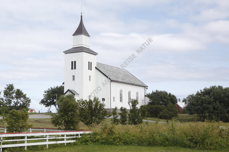 Andenes, Andøya, Baum, Bauwerk, Flora, Gebäude, Holzkirche, Kirche, Kirchturm, Nordland, Norwegen, Sakralbau, Strauch, Turm, Vesterålen,