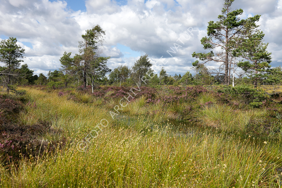Baum, Bauwerk, Besenheide, Calluna vulgaris, Birkengewächs, Entwässerungsgraben, Feuchtgebiet, Flora, Gras, Haufenwolke, Cumulus, Heidekrautgewächs, Kanal, Kiefer, Pinus, Kieferngewächs, Kittlakull, Landschaft, Moor, Moor-Birke, Betula pubescens, Nationalpark, Ort, Rasenbinse, Trichophorum cespitosum, Sauergrasgewächs, Scheuchzers Wollgras, Eriophorum scheuchzeri, Schweden, Småland, Store-Mosse, Store-Mosse-Nationalpark, Verkehrsweg, Wetter, Klima, Wolke,