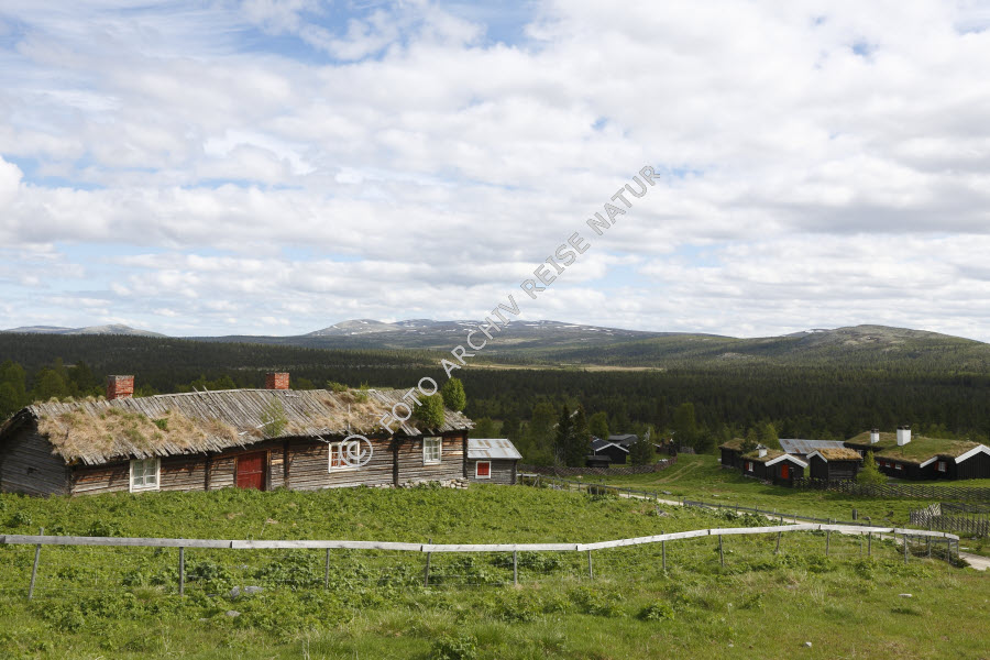 Alm, Bauwerk, Bergkette, Bergmassiv, Dorf, Fjell, Gebirge, Gebäude, Holzhütte, Hütte, Kulturlandschaft, Landschaft, Norwegen, Oppland, Ringebufjellet, Weide, Weiler,