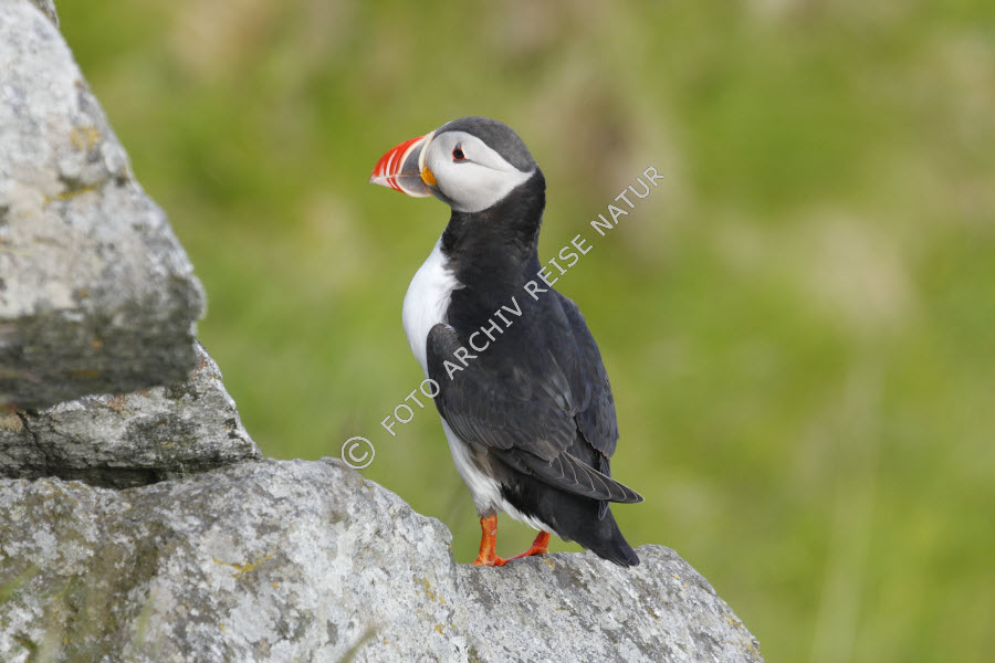 Keywords: Alkenvögel, Farbe, Fauna, Felsblock, Felsbrocken, Felsen, Insel, Insel Runde, Landschaft, Material, Møre og Romsdal, Norwegen, Papageitaucher, Fratercula arctica, Stein, Vogel, rot, schwarz, weiß,