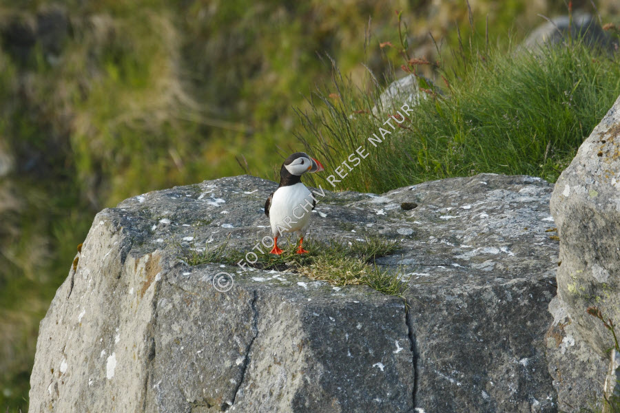 Keywords: Alkenvögel, Farbe, Fauna, Felsblock, Felsbrocken, Felsen, Flora, Gras, Insel, Insel Runde, Landschaft, Material, Møre og Romsdal, Norwegen, Papageitaucher, Fratercula arctica, Stein, Vogel, Wiese, Wiesenhang, grün, rot, schwarz, weiß,