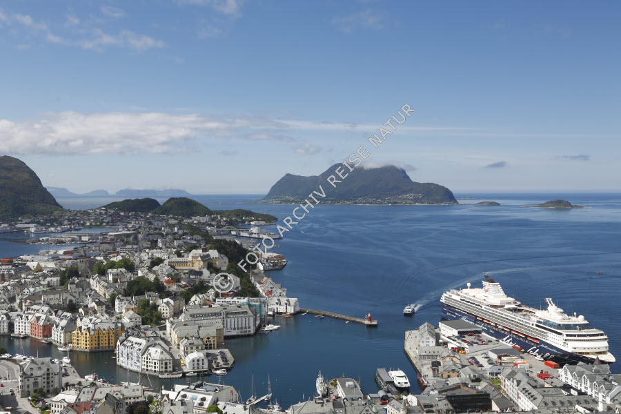 Baustil, Bauwerk, Farbe, Gewässer, Hafen, Hafeneinfahrt, Hafenmauer, Hafenstadt, Insel, Jugendstil, Kai, Kulturlandschaft, Landschaft, Meer, Møre og Romsdal, Nordmeer, Norwegen, Schäre, Stadt, Stadtansicht, blau, Ålesund,