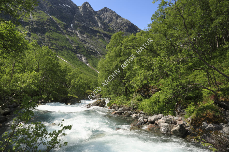 Keywords: Bach, Berg, Bergkette, Bergspitze, Bergwald, Fluss, Gebirge, Gebirgsbach, Gewässer, Gipfel, Grøvdal, Landschaft, Møre og Romsdal, Norwegen, Stromschnelle, Wald, Wiese, Wiesenhang, Åndalsnes, Rauma,