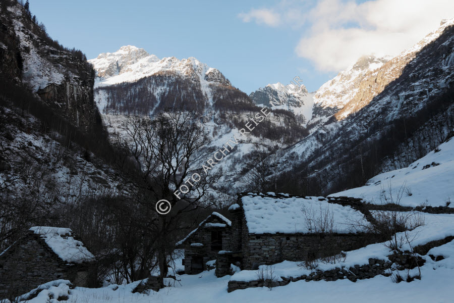 Bauwerk, Berg, Bergdorf, Berghütte, Bergkette, Bergwald, Dach, Dorf, Gebirge, Gebäude, Gebäudeteil, Giebel, Gipfel, Granitdach, Hochtal, Hütte, Kulturlandschaft, Landschaft, Natursteindach, Rustico, Tal, Wald,
