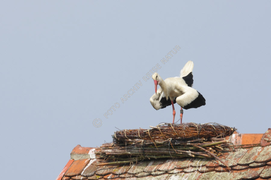 Dach, Deutschland, Fauna, Gebäudeteil, Nest, Rühstäd, Sachsen-Anhalt, Schindeldach, Storchennest, Störche, Tierbau, Vogel, Weißstorch, Ciconia ciconia,