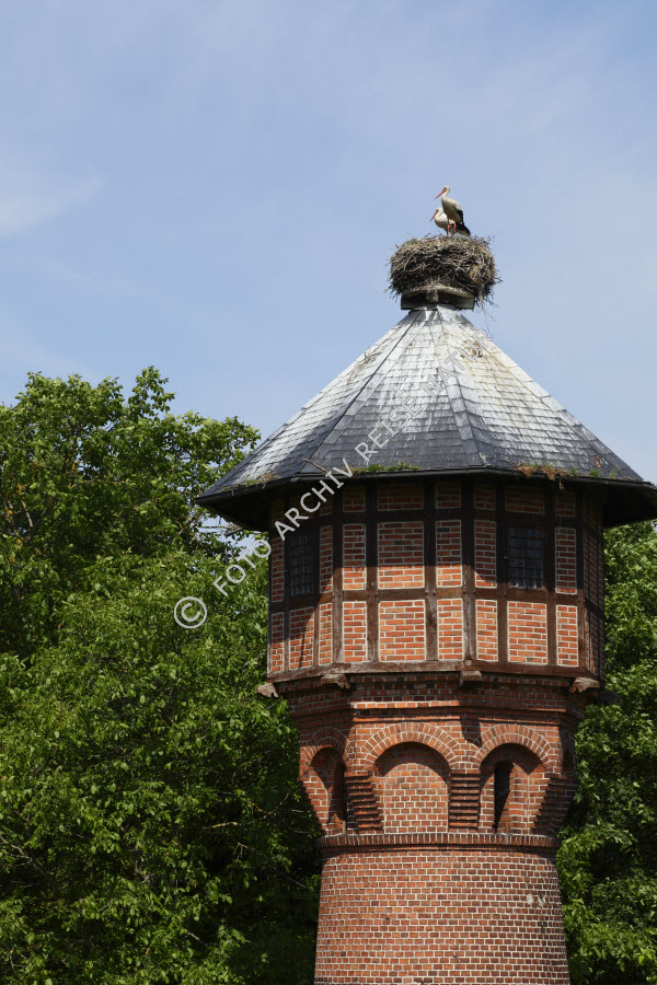 Keywords: Backstein, Baum, Bauwerk, Dach, Deutschland, Fachwerk, Fauna, Flora, Gebäudeteil, Material, Mauer, Nest, Rühstäd, Sachsen-Anhalt, Schindeldach, Stein, Storchennest, Störche, Tierbau, Turm, Vogel, Wasserturm, Weißstorch, Ciconia ciconia,