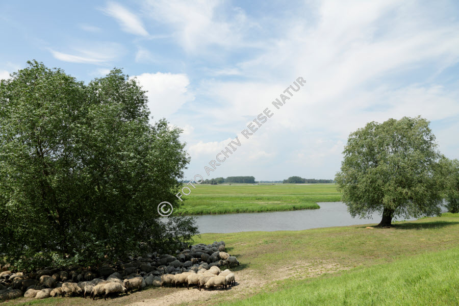 Aue, Baum, Deutschland, Elbaue, Elbe, Fauna, Feuchtgebiet, Flora, Fluss, Gewässer, Gruppe, Herde, Huftier, Kulturlandschaft, Landschaft, Rühstäd, Sachsen-Anhalt, Schaf, Schafherde, Säugetier, Tiergruppe, Totarm, Weide,