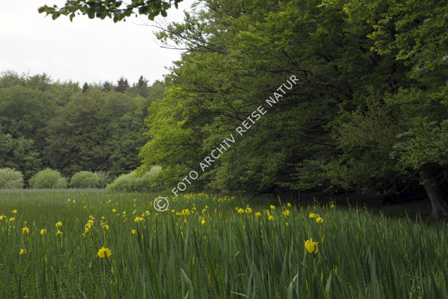 Aue, Baum, Blume, Deutschland, Feuchtgebiet, Fichtenwald, Flora, Jasmund, Landschaft, Mecklenburg-Vorpommern, Nadelwald, Nationalpark, Ort, Rügen, Sassnitz, Schachtelhalmgewächs, Schwertliliengewächs, Strauch, Sumpf-Schwertlilie, Iris pseudacorus, Sumpfwiese, Teich-Schachtelhalm, Equisetum fluviatile, Wald, Wildpflanze,