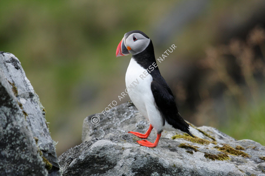 Alkenvögel, Fauna, Felsblock, Felsen, Goksøyr, Insel, Insel Runde, Landschaft, Material, Møre og Romsdal, Norwegen, Papageitaucher, Fratercula arctica, Stein, Vogel, Wiese, Wiesenhang,