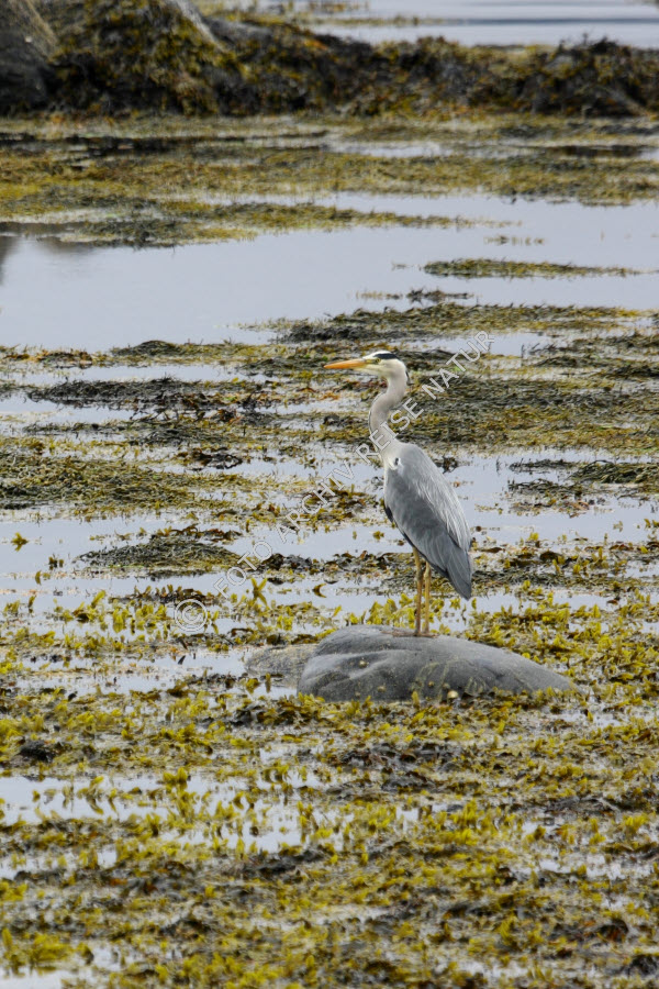 Algen, Blasentang, Fucus vesiculosus, Farbe, Fauna, Flora, Gewässer, Graureiher, Ardea cinera, Insel, Insel Runde, Körperteil, Landschaft, Meer, Møre og Romsdal, Nordmeer, Norwegen, Reiher, Schnabel, Seetang, Vogel, grau,