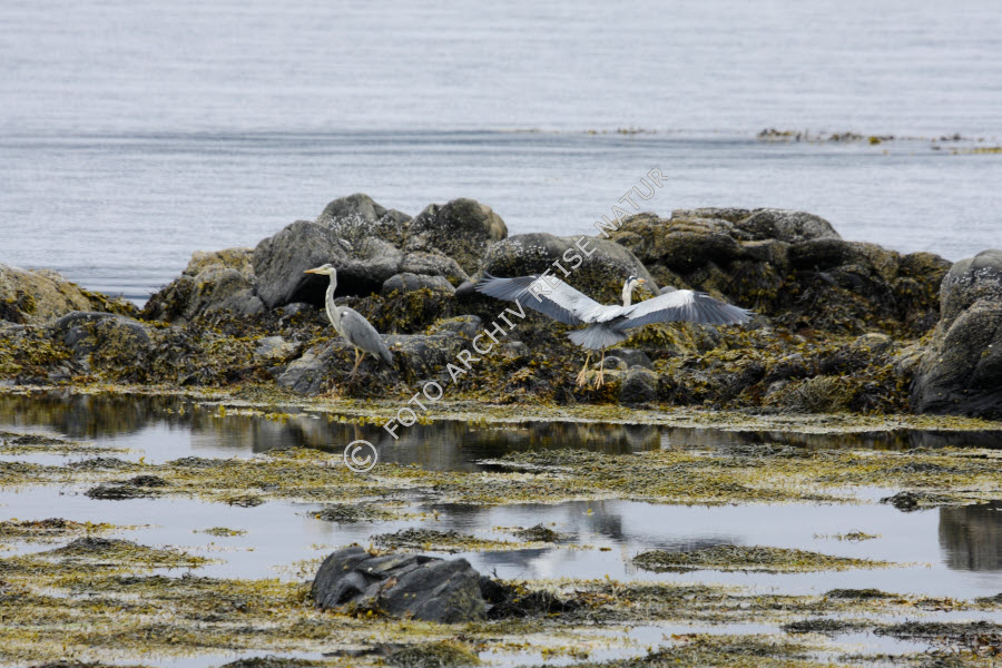 Algen, Blasentang, Fucus vesiculosus, Farbe, Fauna, Flora, Gewässer, Graureiher, Ardea cinera, Insel, Insel Runde, Körperteil, Landschaft, Meer, Møre og Romsdal, Nordmeer, Norwegen, Reiher, Schnabel, Seetang, Vogel, grau,
